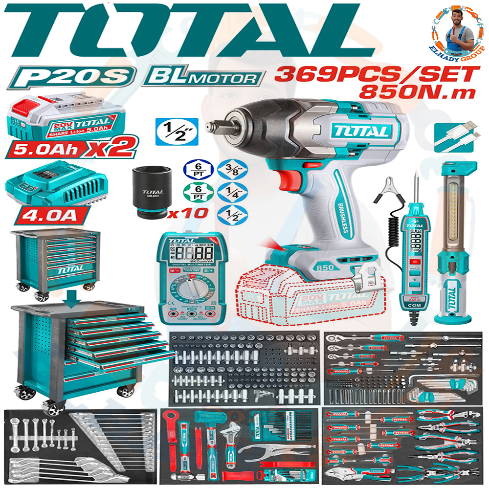 تروللي عدة صاج 369قطعة 7درج ودريل 1/2″ 20فولت 850نيوتن 2بطارية 5امبير توتال_THPTCS83692
