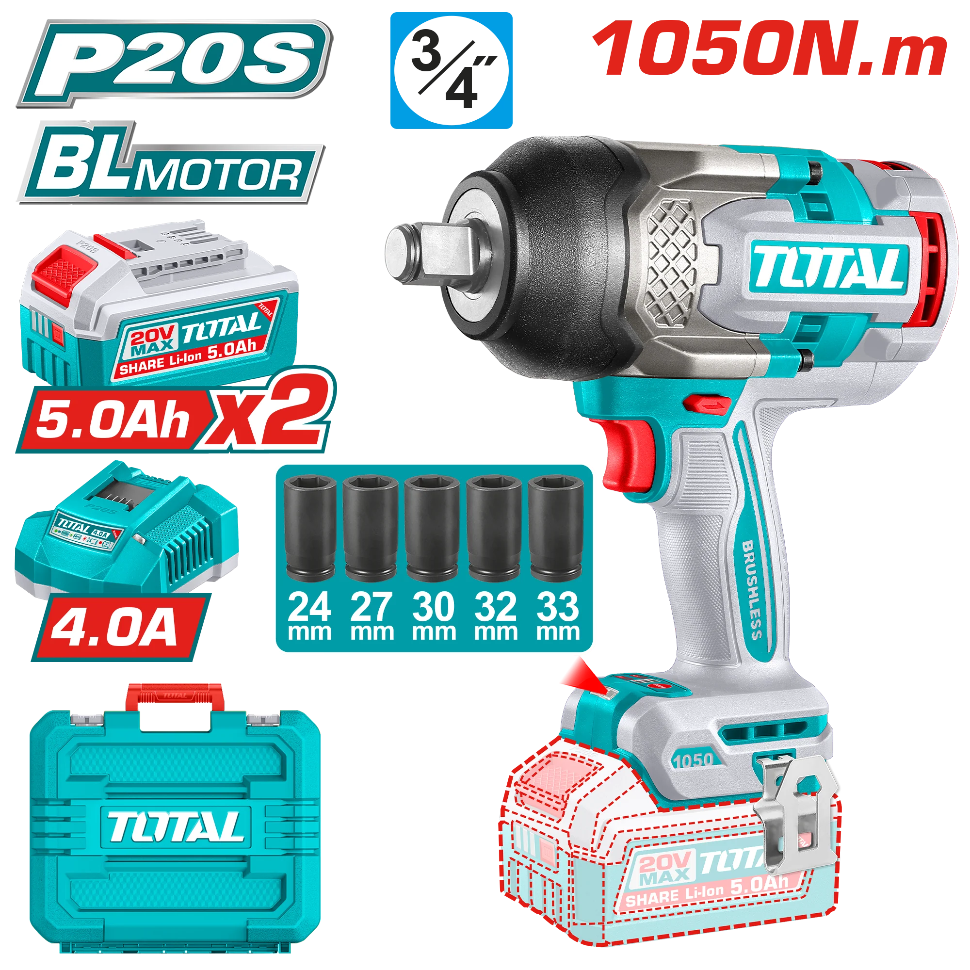 دريل 3/4″ 20فولت 1050نيوتن 2بطارية 5امبير توتال_TIWLI20105