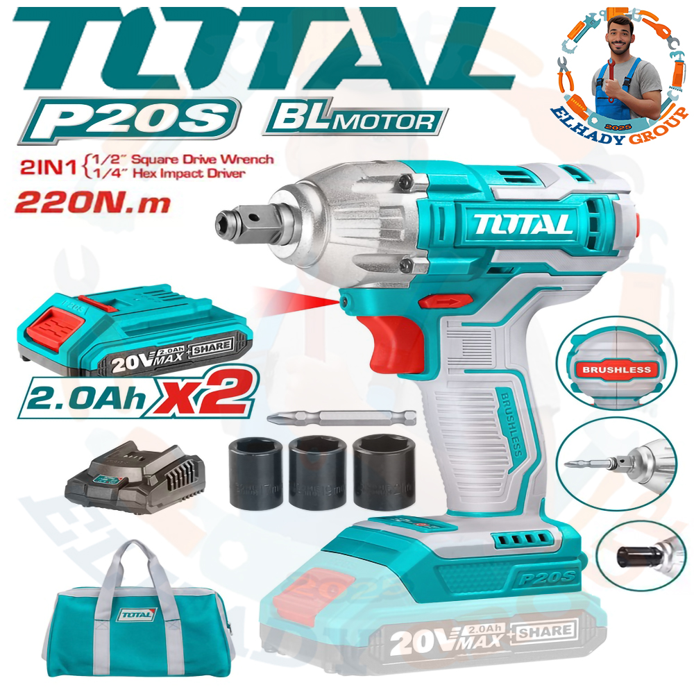 شنيور 2×1 دريل 1/2″ وامباكت 1/4″ 20فولت 220نيوتن 2بطارية 2امبير توتال_TIWLI20208