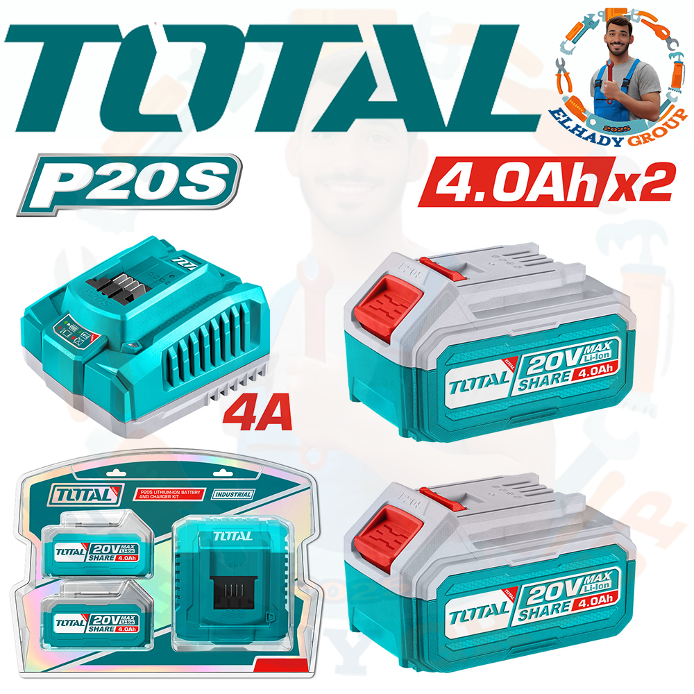 طقم بطارية وشاحن 3قطعة (2بطارية 20فولت 4امبير-1شاحن سريع) توتال_TFBCPK1424