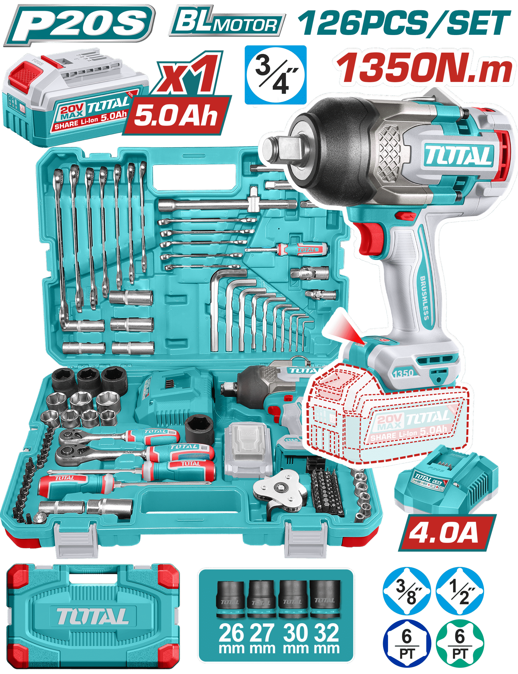طقم عدة 126قطعة دريل 3/4″ 20فولت 1350نيوتن 1بطارية 5امبير توتال_THKTHP31262