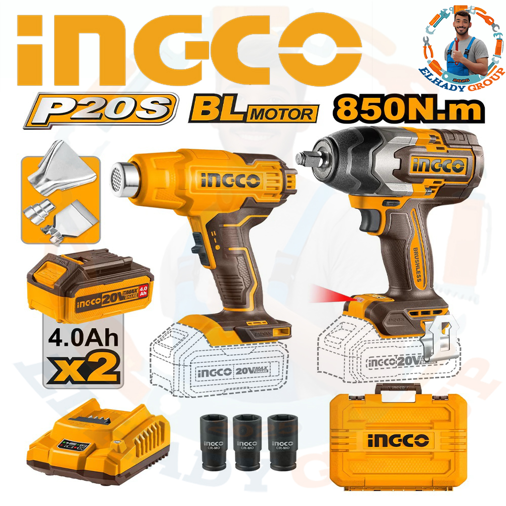 طقم كومبو 2قطعة 20فولت 2بطارية 4امبير دريل 1/2″ 850نيوتن ومسدس تسخين انكو_COSLI240489