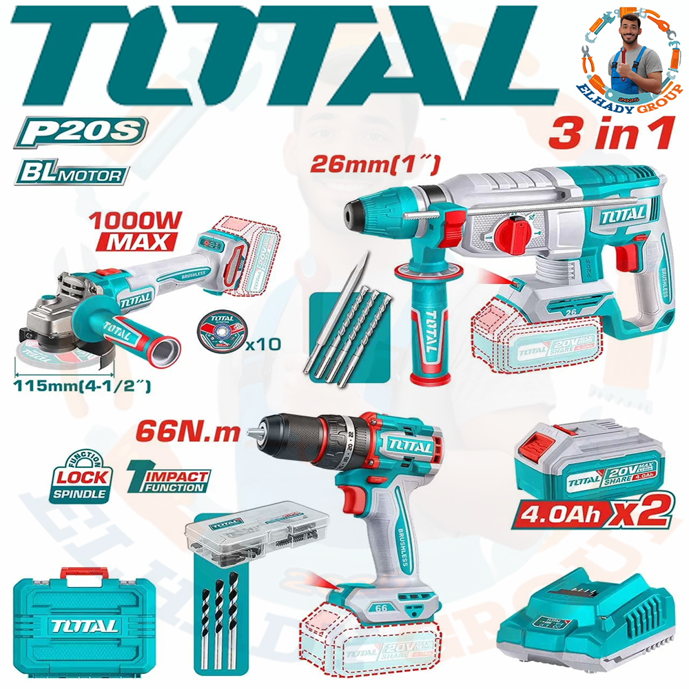 طقم كومبو 3قطع 20فولت 2بطارية 4امبير توتال_TOSLI250184