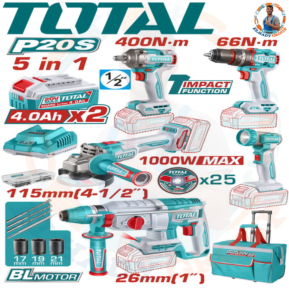 طقم كومبو 5قطع 20فولت 2بطارية 4امبير توتال_TCKLI20592