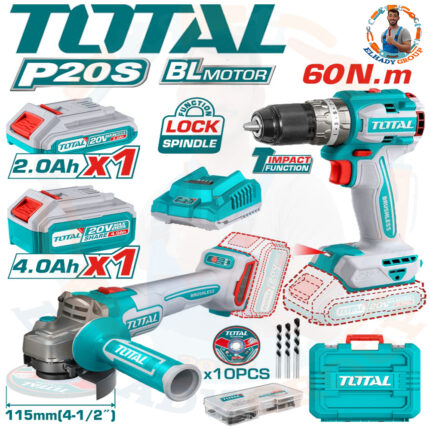 طقم كومبو 20فولت 2قطعة 2بطارية 2-4امبير شنيور 60نيوتن وصاروخ بدون شربون توتال_TCKLI20273